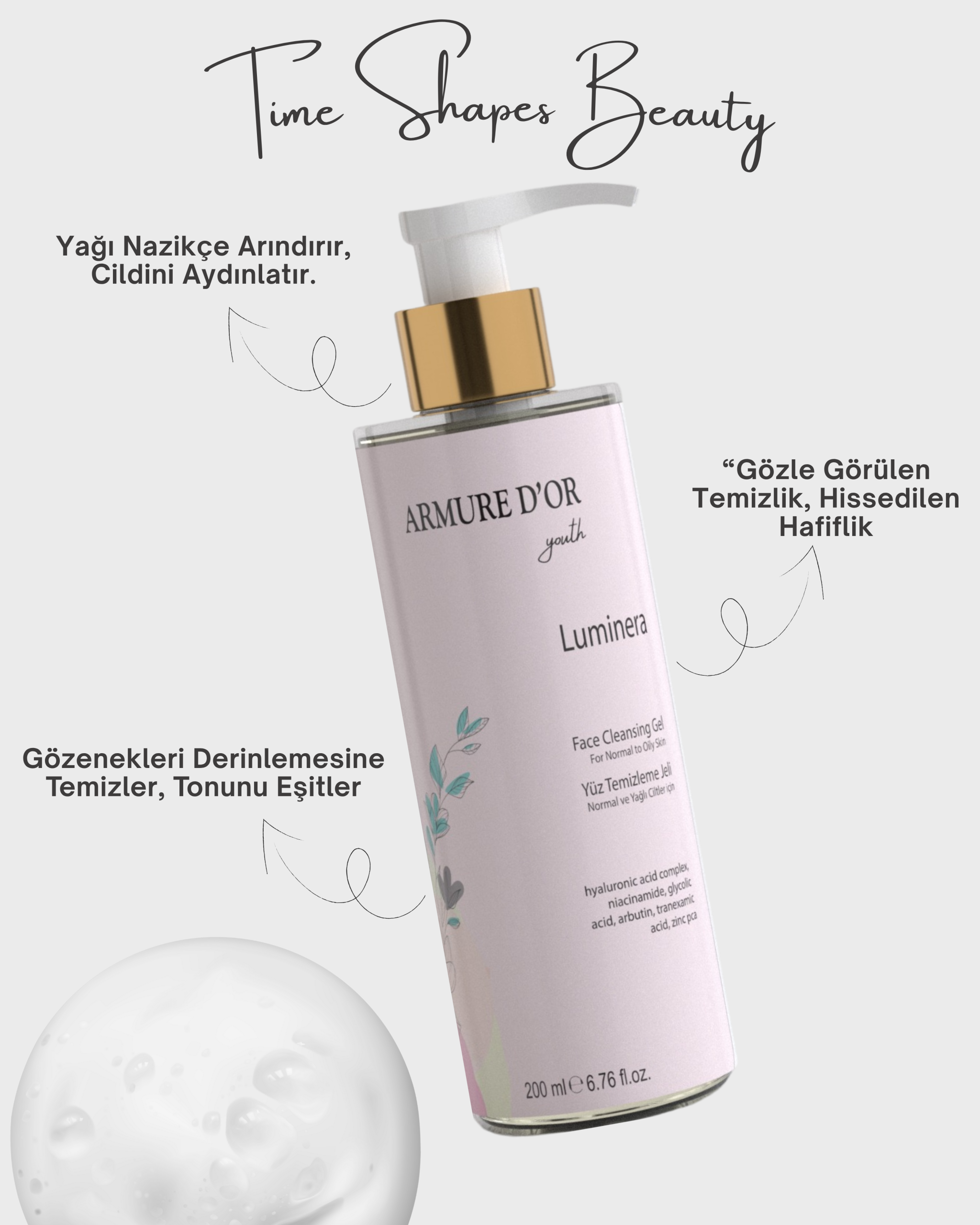 - Armure D’or Luminera Yüz Temizleme Jeli, normal ve yağlıciltlerin günlük bakımında etkili ve nazik bir temizlik sunar. Cildikurutmadan, fazla yağı ve kirleri uzaklaştırarak cildin doğal dengesinikorumaya yardımcı olur.