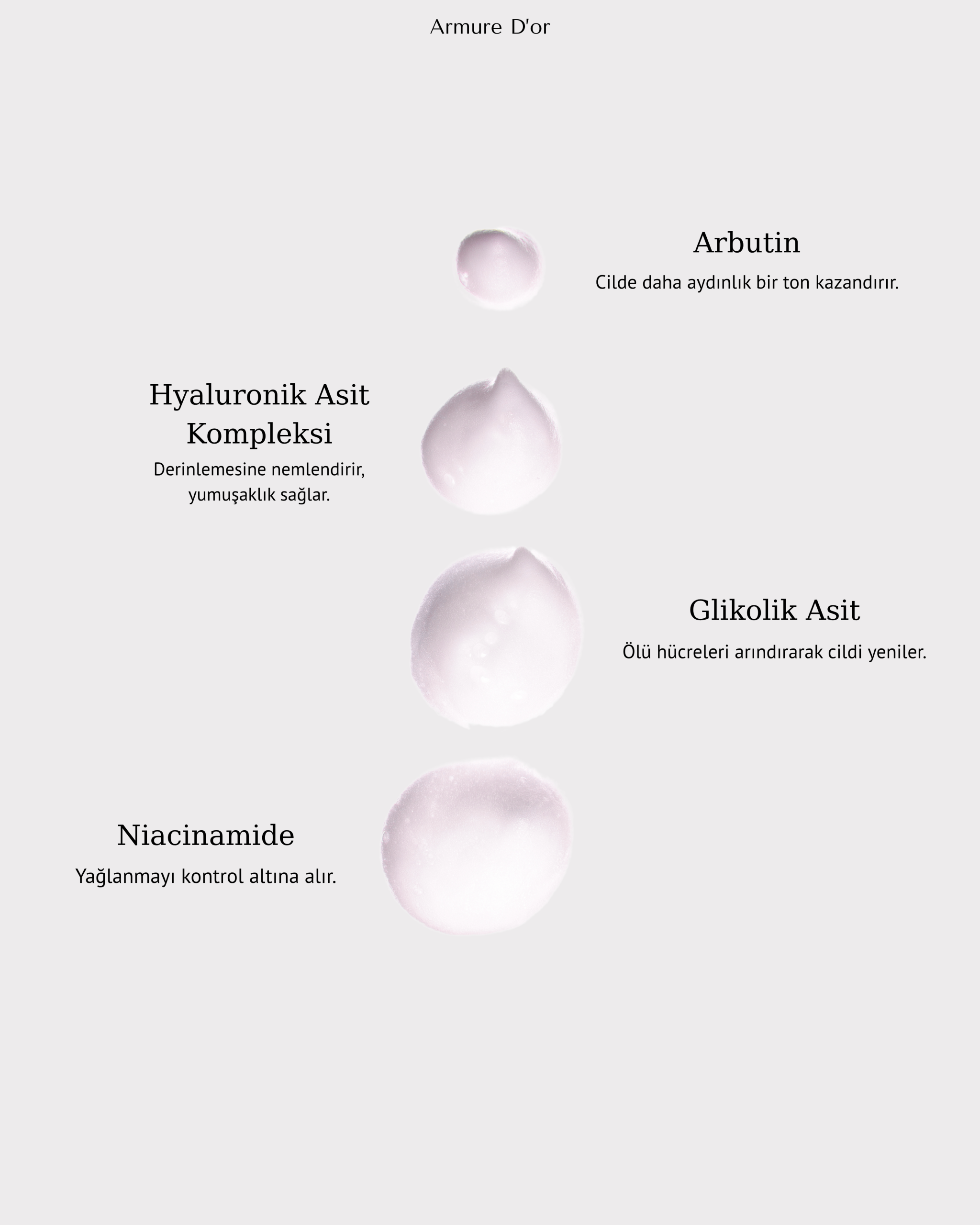 - Glikolik Asit, ölü cilt hücrelerini uzaklaştırarak cildindaha aydınlık ve pürüzsüz görünmesine katkı sunar. Düzenli kullanımda cilt tonudaha eşit ve canlı bir hale gelir.
